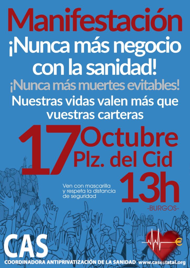 Está claro que todo este escandaloso negocio a costa de nuestras vidas seguirá si no lo paramos. Es preciso reforzar la Atención Primaria con medios humanos y organizativos que pongan el foco en la Salud Pública, la Atención Comunitaria y los factores sociales de la enfermedad. Hay que abrir las camas cerradas en los hospitales públicos, echar a las empresas privadas de la sanidad y acabar con el lucro privado.