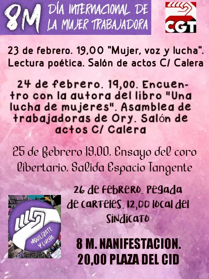El 8 de marzo, desde CGT conmemoramos el día internacional de la mujer trabajadora, En este día, tenemos pensamientos para las mujeres zapatistas y para las mujeres afganas, para las mujeres de Rojava y para todas las luchadoras que nos inspiran a mantenernos organizadas y unidas.