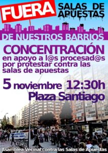 El sábado 5 de noviembre a las 12:30 horas en la Plaza Santiago de Gamonal, la Asamblea Vecinal contra las Salas de Apuestas ha convocado una concentración de apoyo con los vecin@s procesados, y desde la CGT animamos a participar en esta lucha que es de tod@s.