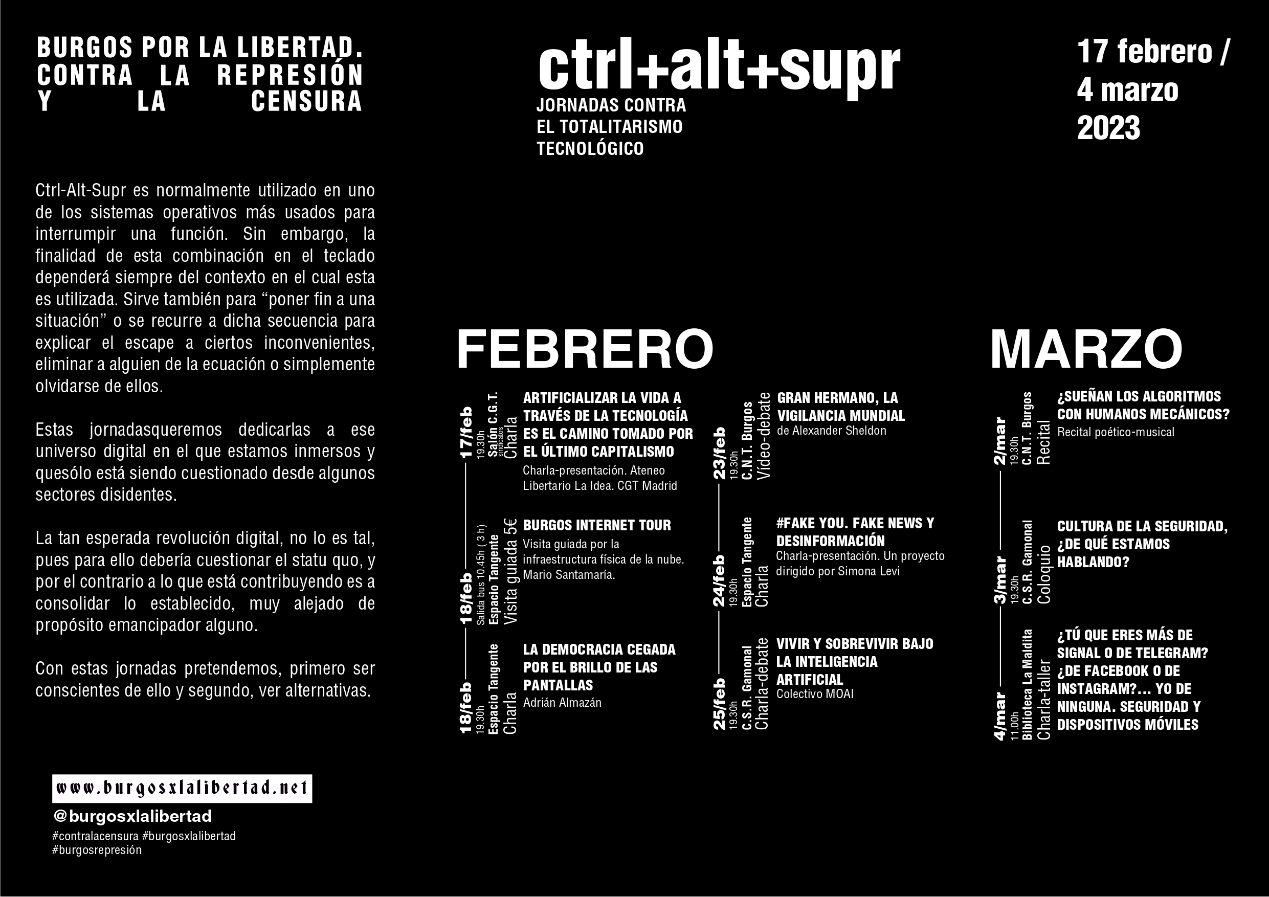 Entre el 17 de febrero y el 4 de marzo, se desarrollarán estas jornadas organizadas por Burgos por la Libertad, Contra la Represión y la Censura (en la que participan diversos colectivos de la ciudad, entre ellos CGT). Serán nueve días de encuentro para el análisis, la reflexión, el debate y lo que surja…, dejando espacio a la creación artística, la poesía y la música.