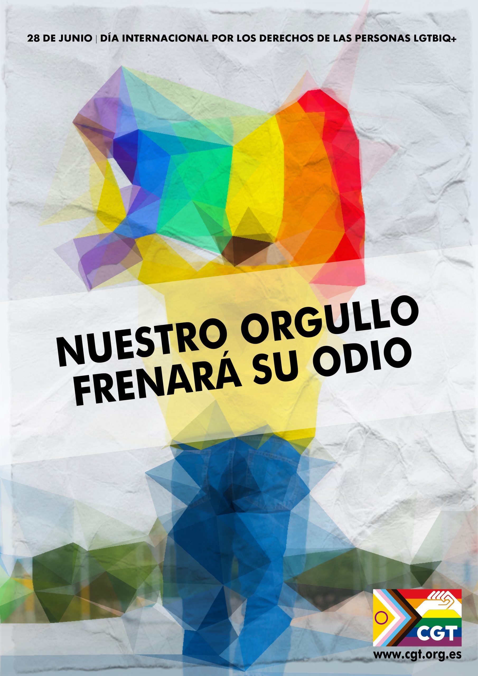 Pero desde CGT tenemos bien claro lo que significa el 28 de junio tanto para nosotras, como para miles de personas. Es un día en el que, de manera festiva, colorida, alegre, solidaria y atrevida, hemos de salir a la calle a reivindicar con orgullo los derechos de las personas LGTBIQ+, a las cuales estamos viendo casi a diario como se las discrimina y se las agrede por su condición sexual y comprobando como este tipo de agresiones va en aumento año tras año.