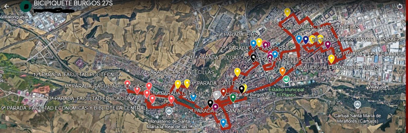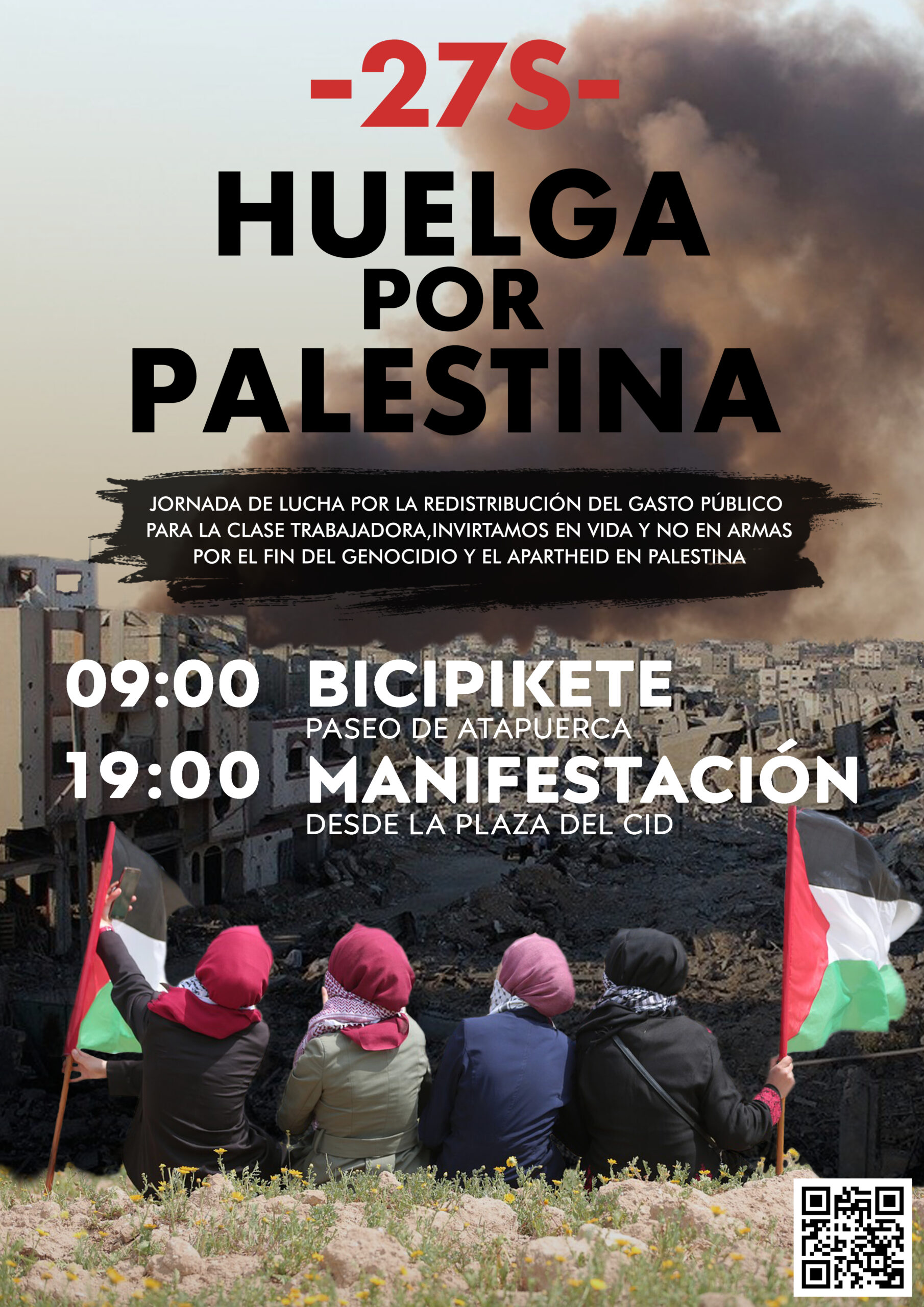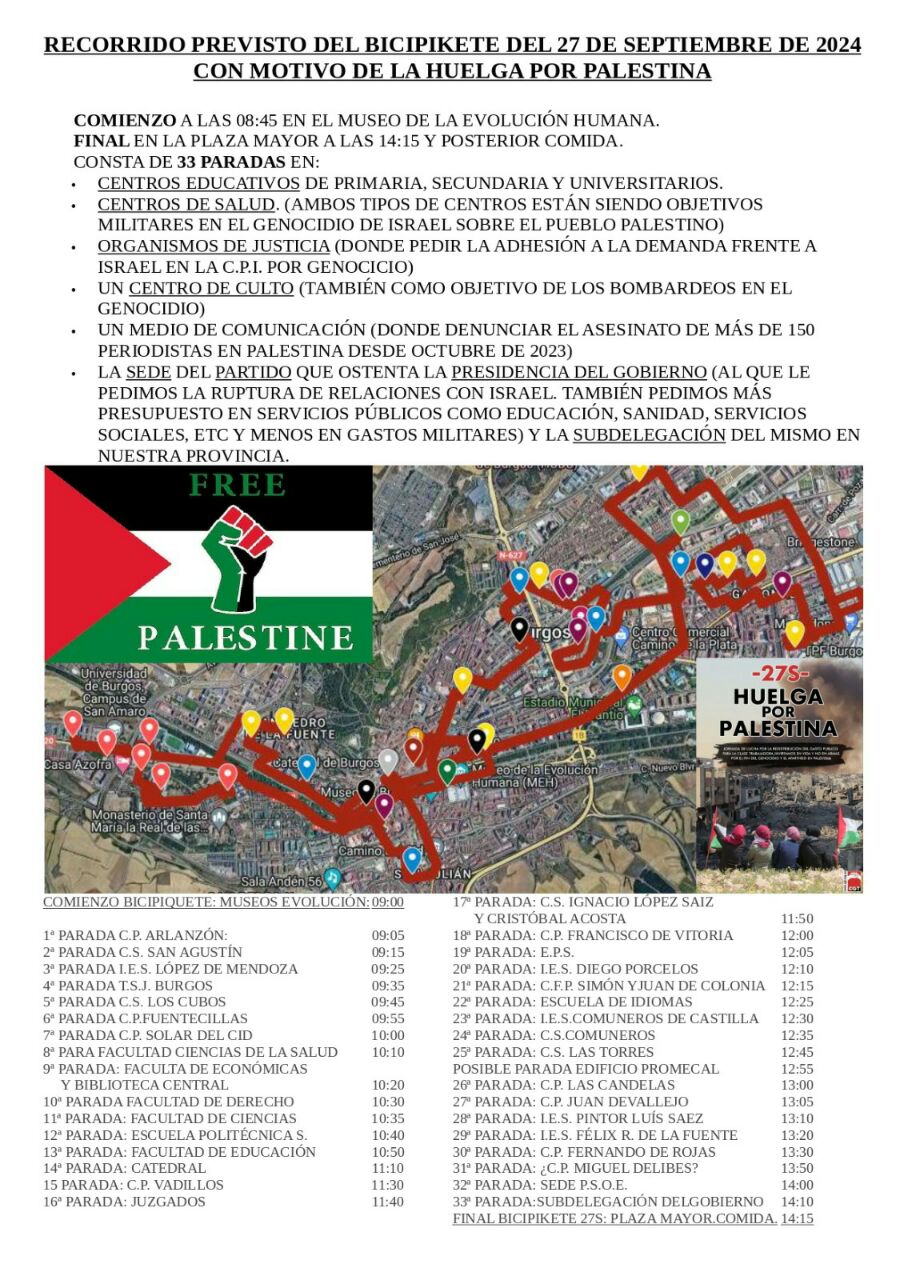 Por la mañana realizaremos un bicipikete desde las 9h, partiendo del Paseo de Atapuerca y recorriendo los centros sanitarios, educativos, sociales..., que en Palestina son objetivo de las bombas.