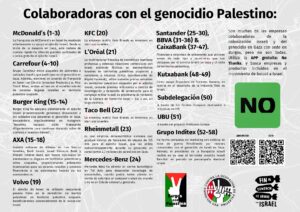 Estas fiestas han estado particularmente llenas de acciones de denuncia y concienciación. Se ha preparado una exposición en El Granero que recoge la historia de la ocupación en Palestina, la situación actual, las acciones llevadas a cabo y las empresas de nuestra ciudad que cooperan con el sionismo. Que nadie diga que no sabe qué puede hacer para luchar contra estos crímenes.