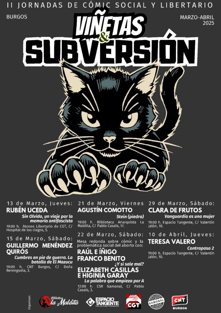 Regresa Viñetas & Subversión con las II Jornadas de Cómic Social y Libertario que tendrán lugar en Burgos durante los meses de marzo y abril. Unas jornadas que buscan poner en valor, entre otras cosas, la conciencia crítica, la recuperación de la memoria histórica, el feminismo y el pensamiento libertario, a través del lenguaje del cómic. Al igual que en la edición anterior, Viñetas & Subversión representa una iniciativa que se desarrollará en diferentes espacios de la ciudad y que ve la luz gracias al esfuerzo conjunto de varias organizaciones y colectivos. El amplio programa de 2025 cuenta con la presencia tanto de valores emergentes, como otros ya consagrados en el 9º Arte desde hace años. Además, se ha querido dar especial visibilidad a la cada vez mayor presencia de autoras en el mundo de la novela gráfica, así como a los creadores locales, que tendrán también su espacio.