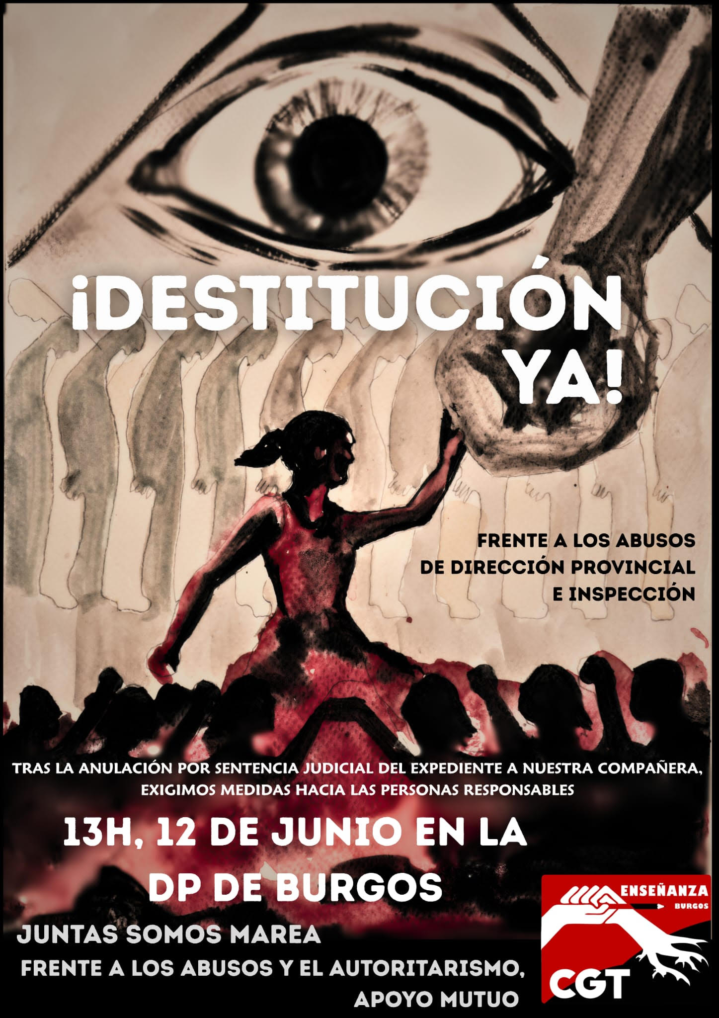 La Sección Sindical de Enseñanza de CGT Burgos ha convocado una concentración este jueves 12 de junio a las 13:00 frente a la Dirección Provincial de Educación para exigir el cese de la inspectora N.C.R. por los expedientes abiertos en la provincia de Burgos.