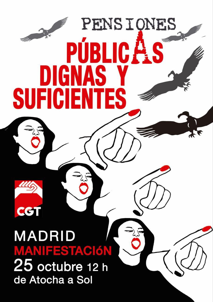 Por todo ello CGT, una vez más, ante la situación del futuro de las pensiones públicas hacemos un llamamiento a la clase trabajadora, trabajadores/as actualmente en activo y pensionistas, a caminar juntos y acudir a la manifestación del 25 de octubre en Madrid para defender el Sistema Público de Pensiones como un derecho inalienable.