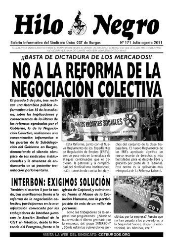 Boletín Informativo del Sindicato Único CGT de Burgos. Nº 171. Julio-agosto 2011 «EL AUTÉNTICO SINDICALISMO NO PIERDE EL TIEMPO PROMETIENDO AL OBRERO UN PARAÍSO EN LA TIERRA, SINO QUE LE LLAMA PARA CONQUISTARLA Y LE ASEGURA QUE NADA DE CUANTO HAGA SERÁ COMPLETAMENTE EN VANO»