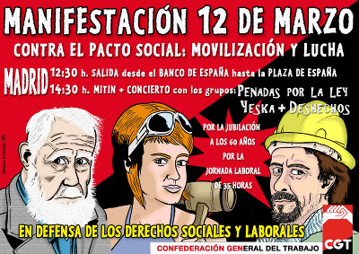 AUTOBUSES DESDE BURGOS para acudir a la manifestación contra el pacto social en Madrid, con salida alas 9 horas y regreso desde Madrid a las 18. Inscripciones en CGT (Calera, 12 · 947203472 · ) Por la Jubilación a los 60 años – Por la...