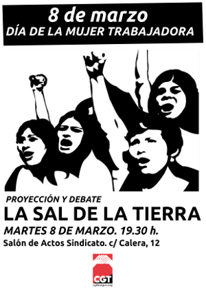 8 de marzo: Día de la Mujer Trabajadora PROYECCIÓN Y DEBATE «LA SAL DE LA TIERRA» Martes 8 de marzo. 19.30h. Salón de Actos Sindicato (c/Calera, 12)