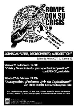 Los próximos 26 y 27 de febrero hemos organizado unas Jornadas bajo el lema «Crisis, Decrecimiento, Autogestión», que nos permitan debatir y reflexionar alternativas a la crisis sistemática que supone el sistema capitalista, depredador de la vida. Ambas charlas tendrán lugar en el Salón de...