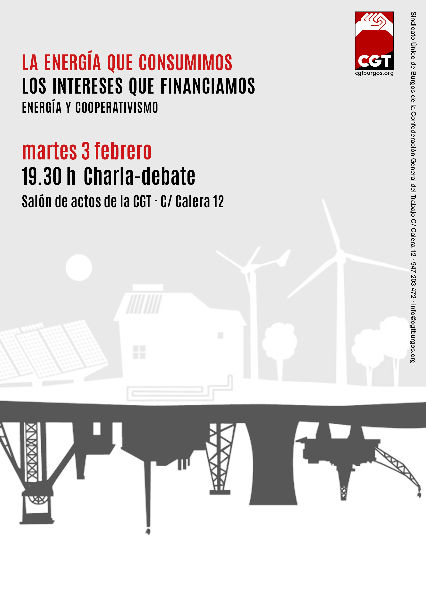 Charla debate: la energía que consumimos; los intereses que financiamos. Martes 3 de febrero. 19. 30 horas. Salón de actos de la CGT C/ Calera 12 Entre el año 2008 y el 2014 el recibo de la luz ha subido para las familias del Estado...