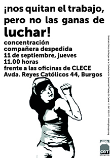 Jueves 11 de septiembre. 11:00 horas Concentración frente a las oficinas de CLECE Avda. Reyes Católicos 44, Burgos Emma trabaja como preparadora de catering en CLECE (Grupo ACS – Florentino Pérez), en la concesión de comidas a domicilio para personas dependientes del Ayuntamiento de Burgos....