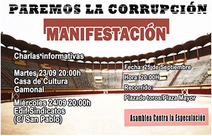 Manifestación. 25 de septiembre 20.00 horas. Plaza de toros. No a la plaza de toros. La corrupción nos desangra. Desde la Asamblea contra la Especulación, que echa a andar denunciando la pretensión del Ayuntamiento de Burgos de querer ejecutar una obra desorbitada para las necesidades...