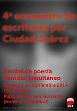 4º Encuentro de Escritores por Ciudad Juárez.Recital de poesía mundial simultáneoViernes 5 de septiembre 201419:30 horasPlaza del Rey San Fernando (frente a la Catedral) En septiembre de 2011 un grupo de jóvenes escritores comprometidos, desde la frontera de México, en el estado de Chihuahua, convocaron...