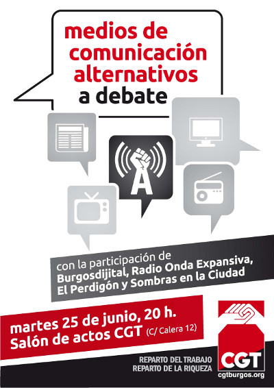 Ayer, 25 de junio, se celebró una mesa redonda sobre medios de comunicación alternativos organizada por la CGT, con un gran gran éxito de asistencia y participación. Los ponentes, de El Perdigón, Radio Onda Expansiva, Sombras en la Ciudad y Burgosdijital, nos hablaron de sus...