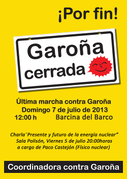 Convocatoria a la última marcha contra Garoña La Coordinadora contra Garoña, colectivo que agrupa diversos grupos ecologistas y sociales de Burgos, La Rioja y Euskadi, y de la que forma parte la CGT, convocamos para este domingo 7 de julio la Última marcha contra Garoña. ...