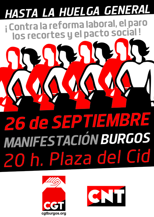 CONTRA LA REFORMA LABORAL, LOS RECORTES, EL PARO Y EL PACTO SOCIAL: NADA QUE NEGOCIAR MANIFESTACIÓN EN BURGOS MIÉRCOLES 26 DE SEPTIEMBRE · 20 horas · PZA. DEL CID MANIFESTACIÓN EN MIRANDA DE EBRO 20 horas · Delegación Junta (C/ La Estación) MANIFESTACIÓN EN ARANDA...