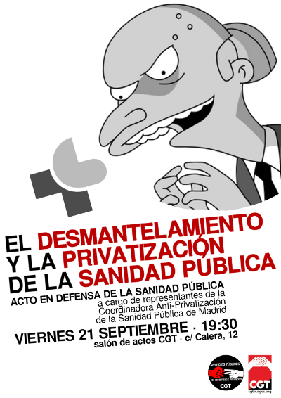 VIERNES 21 DE SEPTIEMBRE · 19.30 h · SALÓN ACTOS C/ CALERA, 12″EL DESMANTELAMIENTO Y LA PRIVATIZACIÓN DE LA SANIDAD PÚBLICA» Acto a cargo de representantes de CAS-madrid y trabajador@s de Burgos. Con el falso argumento de la crisis y bajo el dictado de la...